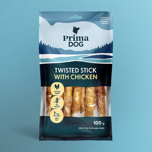 PrimaDogin Kanapurutikku on pieni ja herkullinen koiran puruluu nirsompaankin makuun. Hampaita mekaanisesti puhdistava ohut naudannahkatikku on päällystetty mehukkaalla kanafileellä, joka katoaa varmasti parempiin suihin!