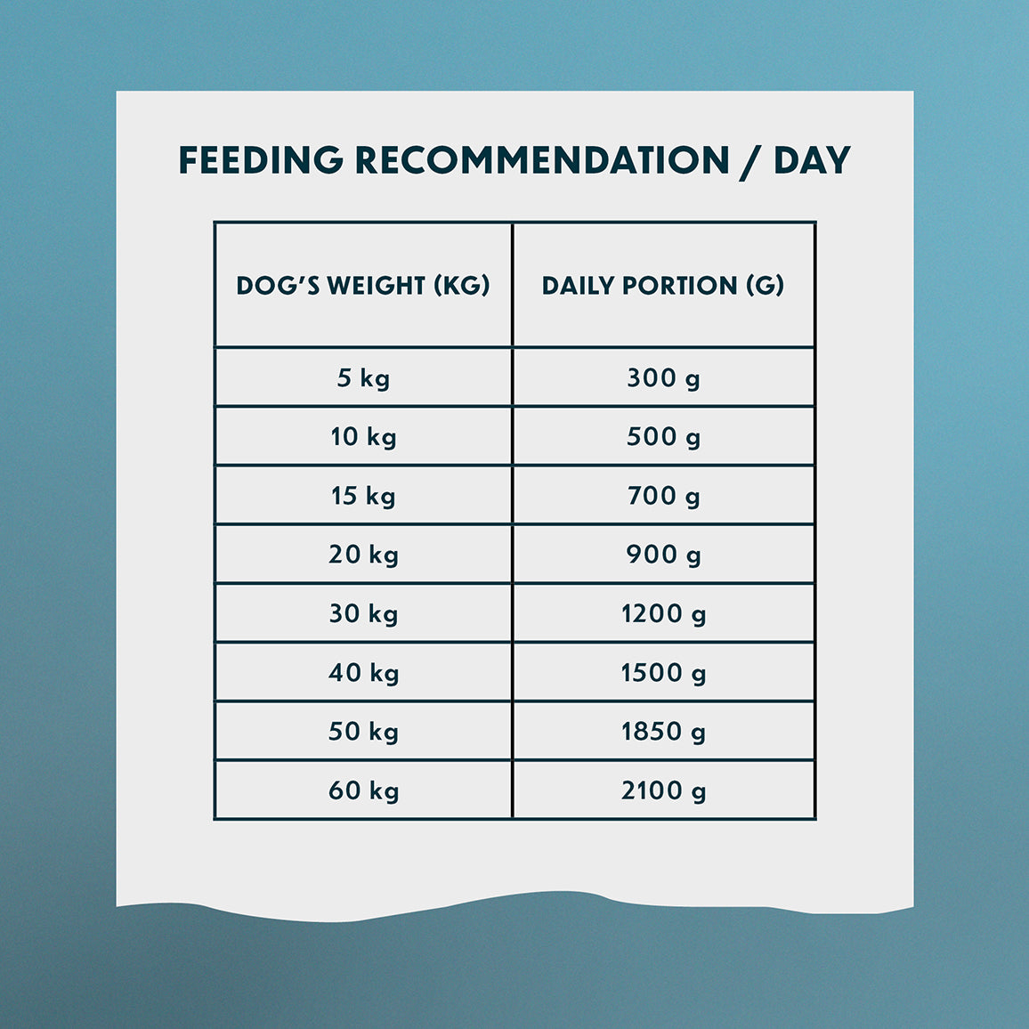 Koiran paino (kg) Päiväannos (g) 5 kg 300 g 10 kg 500 g 15 kg 700 g 20 kg 900 g 30 kg 1200 g 40 kg 1500 g 50 kg 1850 g 60 kg 2100 g Ruokintaohjeet ja käyttöohjeet
