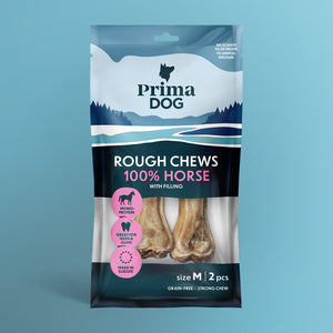 PrimaDog Rough Chews 100 % Horse -täytepuruluu on valmistettu kokonaan hevosesta, joten se sisältää ainoastaan yhtä eläinproteiinia. Hypoallergeeninen puruluu voi sopia myös koirille, jotka ovat aikaisemmin saaneet allergisia oireita muista proteiinin lähteistä, kuten esimerkiksi naudasta. Täytepuruluu koostuu hevosen vuodasta ja rouhetäytteestä, ja se maistuu paitsi herkulliselta, myös tukee suun terveyttä sekä tarjoaa aktivointia lajityypillisen tekemisen parissa. Sen sitkeä koostumus sopii erityisesti vahvemmalle puruvoimalle ja tarjoaa pitkäkestoista aktivointia.