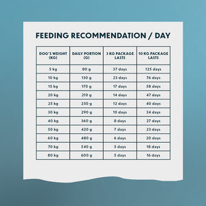 Koiran paino (kg) Päiväannos (g) 5 kg 80 g 10 kg 130 g 15 kg 170 g 20 kg 210 g 25 kg 250 g 30 kg 290 g 40 kg 360 g 50 kg 420 g 60 kg 480 g 70 kg 540 g 80 kg 600 g Ruokintaohjeet ja käyttöohjeet