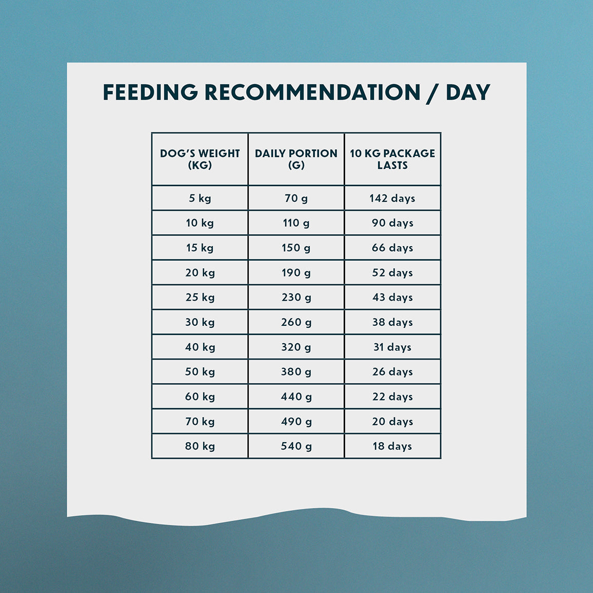 Koiran paino (kg) Päiväannos (g) 5 kg 70 g 10 kg 110 g 15 kg 150 g 20 kg 190 g 25 kg 230 g 30 kg 260 g 40 kg 320 g 50 kg 380 g 60 kg 440 g 70 kg 490 g 80 kg 540 g Ruokintaohjeet ja käyttöohjeet